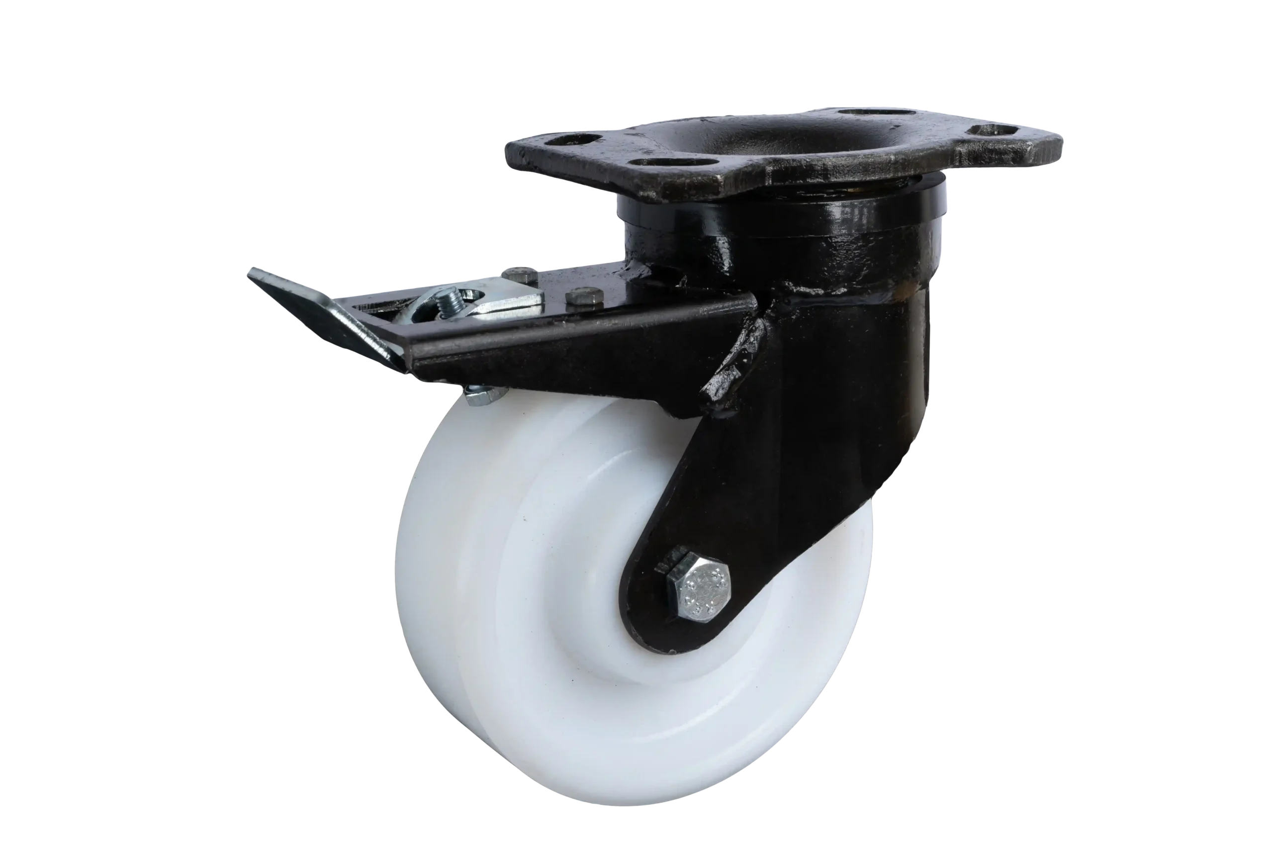 This UHMW polymer I-Type wheel with heavy-duty forged steel castor offers reliable braking performance along with smooth, controlled movement. The reinforced design ensures high load capacity, wear resistance, and precise tracking, ideal for heavy industrial applications. Perfect for systems requiring control and stability, it guarantees long-lasting durability under demanding conditions. A dependable solution for equipment needing both mobility and secure stopping power.