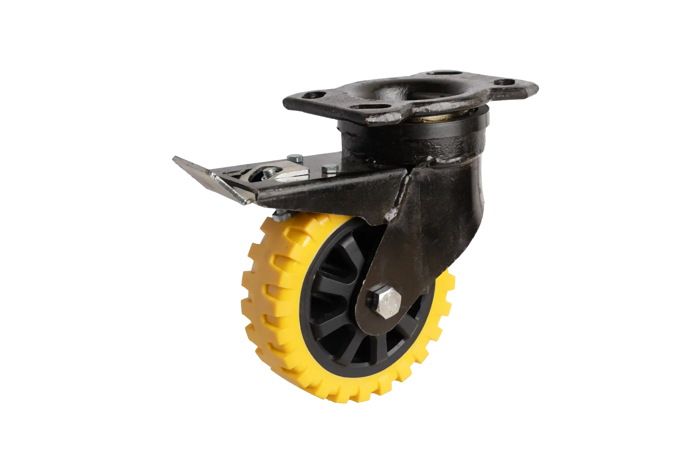 Ensure safety and control with our 6″ Yellow Anti-Skid Polyurethane Wheel with 2-inch Width and Heavy Duty fabricated Steel Castor with Swivel and Integrated Brake. Designed for heavy-duty industrial applications, this wheel features a yellow anti-skid polyurethane tread, providing excellent grip on slippery or uneven surfaces. The heavy-duty fabricated steel core ensures superior strength and durability, while the 360° swivel movement allows for easy and precise directional changes. The integrated brake system securely locks both the wheel and swivel mechanism, ensuring maximum stability and safety when the equipment is stationary. With a 6-inch diameter and 2-inch width, this castor is perfect for applications where secure, controlled movement and floor protection are required.